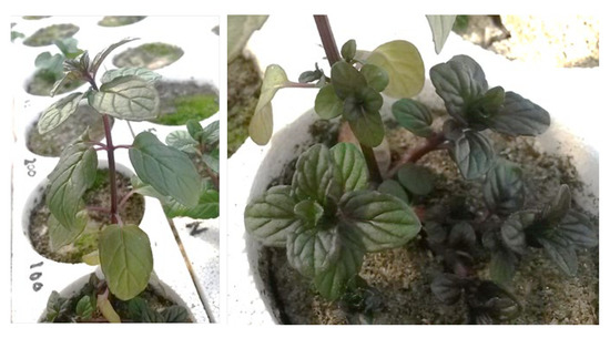 In contrast, the addition of a fungicide to the artificial endosperm did not seem to have any positive effect on the sprouting (emergence) at least compared to the control treatment (TM0). It is clear that the use of thiophanate-methyl was irrelevant under the experimental conditions applied, since a sowing substrate consisting of a mix of sand and peat (1:3, v:v) and tap water for irrigation in the greenhouse was used, in an environment not entirely controlled from a phytosanitary point of view and in the absence of exogenous pesticide treatments. The indirect control of pathogens in the absence of the fungicide (TM 0) could also be due to the conversion precocity, concentrated within the first 15 days. As a consequence, the use of fungicide for the control of any pests was probably unnecessary, because thiophanate-methyl at higher concentrations also seemed to affect the performance of the synthetic spearmint seeds. This result is different from that reported by Germanà et al. [13] by using in vitro derived somatic embryos of Citrus reticulata Blanco. However, in general, the difficulties of sowing artificial seeds directly in soil or in commercial substrates under nonsterile conditions are considered one of the main limitations of the practical use of this technology [11,14,15,16,17]. There are studies only partly similar to the one described. Under non-aseptic conditions, Bapat and Rao [18] encapsulated in vitro derived axillary buds of Morus indica in an autoclaved alginate matrix containing either of the fungicides carbendazim, benomyl and bavistin to prevent contamination when sown in soil. Lata et al. [19] studied in vivo conversion placing synthetic seeds of Cannabis sativa in pots containing 1:1 potting mix-fertilome with natural coco growth medium moistened with full strength MS medium, supplemented with PPM. Encapsulated somatic embryos of Paulownia elongata were sown in vials containing peat and perlite (3:1) and incubated under growth chamber conditions to evaluate their conversion after 5 weeks [20].