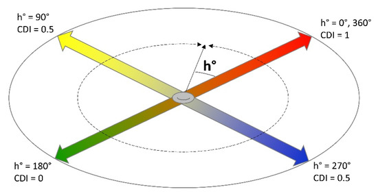 CieLAB colour space and representation of hue angle (h°) and Colour Development Index (CDI) values around the colour wheel (adapted with permission from Scalisi et al. [8]).