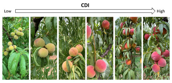 Scanning east and west sides of the canopies separately unveiled a significant tendency to yield redder fruit (i.e., highest CDI) in the west-facing side of the canopy (Figure 5 and Figure 6)–fruit that are exposed to afternoon sun. Fruit exposed to the afternoon sun were likely to experience a combination of high light and temperature regimes that drove more pronounced red pigmentation development. Fruit exposure to sunlight was previously linked to significant changes in hue angle in ‘Loring’ and ‘Raritan Rose’ peaches [31].