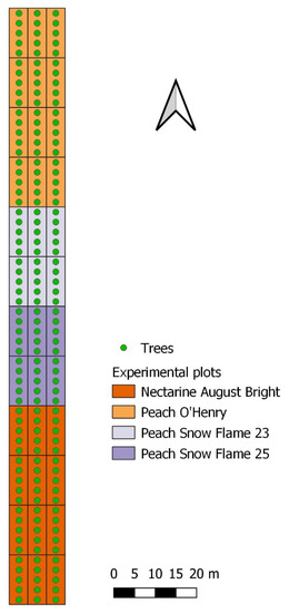 Georeferenced csv files obtained with Green Atlas software were uploaded into QGIS (v. 3.16, QGIS Development Team, Open Source Geospatial Foundation, 2021) and combined with the experimental plot and tree layers shown in spatial maps in Figure 3 and Figure 4. Summaries of CDI medians per experimental plot were obtained separately for east and west sides of the canopies at the seven different times of the day when scanning the five cultivars in the experimental plots. CDI medians per row orientation (i.e., E–W, NW–SE, N–S and NE–SW arms used as experimental units) were obtained with a similar process after scanning the ‘Majestic Pearl’ nectarine trees (Figure 4) six times from harvest.