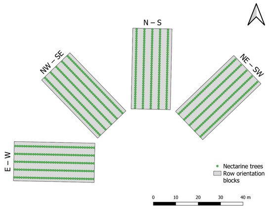 Spatial map of four row orientations and 720 ‘Majestic Pearl’ nectarine trees (180 trees per row orientation block) in the Sundial orchard at the Tatura SmartFarm.
