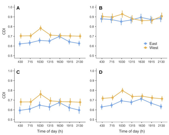 Time of scanning affected CDI and the effect was more pronounced in greener (less mature) fruit (Figure 6A,C,D) than in red, ready-to-harvest fruit (Figure 6B). Measurements of CDI conducted under dark conditions (before dawn and after dusk) were considered the reference for colour measurements as the effect of sunlight on colour perception was removed. Canopies were illuminated using the strobe lights on the Green Atlas Cartographer, which guaranteed same illumination intensity and light quality for both west and east sides of the canopy. In fact, CDI values obtained at 430 and at 2130 h were not significantly different and were practically identical (CDI = 0.682 ± 0.012) when pooling together different cultivars and canopy sides (Figure 7). Sunlight in measurements from 715 to 1915 h caused an increase of the CDI values due to the change of image brightness. However, when pooling together east and west fruit, CDI was not significantly higher in scans at 715, 1315 and 1915 h compared to nocturnal scans (Figure 7). The only significant deviations of CDI values from what observed in dark conditions occurred at 1015 (mid-morning) and 1615 h (mid-afternoon), when the presence of the sun in the background of the image (Figure 5C west and E east) caused a large alteration of the image brightness that was likely to cause the CDI to increase by a few centesimal points. This in turn led to the largest deviation of CDI values from what measured in dark conditions in both east and west sides of the canopies. Using their system, Mirbod et al. [10] noticed that when the sun was in front of the camera, the auto-exposure settings of the LED illuminants attempted to adjust the image brightness using the sky regions and caused a darkening of the foreground canopies, but a similar issue was not encountered in our study. Recent research [11] highlighted a trend to develop camera systems that are illumination-invariant and attempt to overcome the influence of external light and different exposure on the collected images.