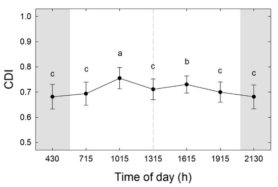 Daily trend of fruit colour development index (CDI) in peach and nectarine cultivars with east- and west-exposed fruit pooled together. Grey bands highlight night-time before sunrise and after sunset, whereas dashed vertical line represents solar noon. Error bars represent 95% confidence intervals of the estimates and different letters show significant differences (p < 0.05) after a Bonferroni post hoc test.