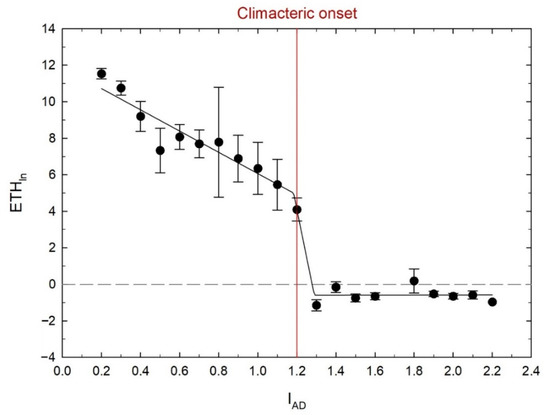 Natural logarithms of ethylene emission (ETHln) and corresponding Index of Absorbance Difference (IAD) in a sample of 123 ‘Majestic Pearl’ nectarine fruit collected at different times before and after harvest in 2020–2021. The horizontal dashed line shows ETHln = 0, whereas vertical error bars represent standard errors of ETHln. The fit is characterised by a piecewise regression with a three-segment line. The vertical red line represents the identified IAD threshold for climacteric onset.