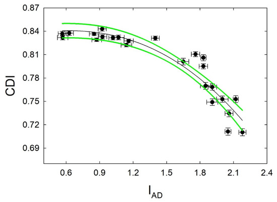 Polynomial regression fit (black line) describing the relationship between Colour Development Index (CDI) and Index of Absorbance Difference (IAD) in ‘Majestic Pearl’ nectarine fruit in 2021–2022. The points represent medians of experimental units (row orientation arm) at different times form harvest (n = 80 per experimental unit); horizontal and vertical bars show standard errors of the means; green lines show 95% confidence intervals. Model equation: CDI = 0.835 (0.004) − 0.030 (0.002) × IAD2 × ln (IAD); p < 0.001; R2 = 0.905; S.E. = 0.015.
