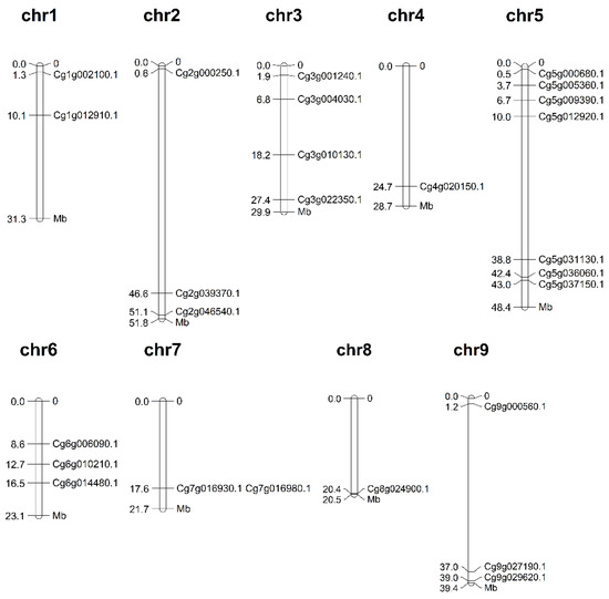 Chromosomal locations of m6A regulatory genes in C. grandis. The chromosomal position of each m6A regulatory gene was mapped according to the genome of C. grandis. The chromosome number is marked at the top of each chromosome and the unit for the scale is megabases (Mb).
