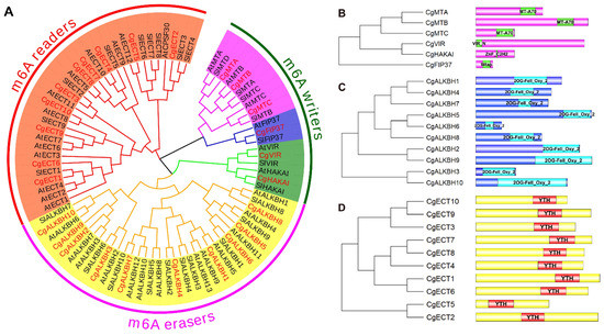 Phylogenetic relationship of the m6A regulatory genes from C. grandis, S. lycopersicum, and A. thaliana. (A) Phylogenetic relationship of m6A regulatory genes from C. grandis, S. lycopersicum, and A. thaliana. (B) MT-A70, VIR-N, ZnF-C2H2, and WTAP conserved domains of m6A writer groups (Pink represents’ MTs; Blue represents’ FIP37s; Green represents’ VIRs and HAKAIs). (C) One highly conserved 2OG-Fell-Oxy-2 domain of m6A eraser groups (Yellow represents’ ALKBHs). (D) YTH conserved domain of m6A reader groups (Orange represents’ ECTs).