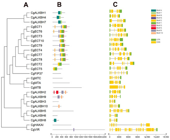 The gene structure analysis of m6A regulatory genes from C. grandis. (A) Phylogenetic relationship of m6A regulatory genes. (B) Conserved motifs analysis of m6A regulatory genes from C. grandis. All motifs were identified by the MEME database with the complete amino acid sequences of m6A regulatory genes from C. grandis. The detailed information for each motif is provided in Figure S1. (C) The exon and intron structures of m6A regulatory genes. Yellow represents exons.