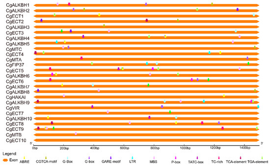 Cis-element analysis of 26 identified m6A regulatory genes in C. grandis from the upstream 1500 bp sequences to the transcription start site.