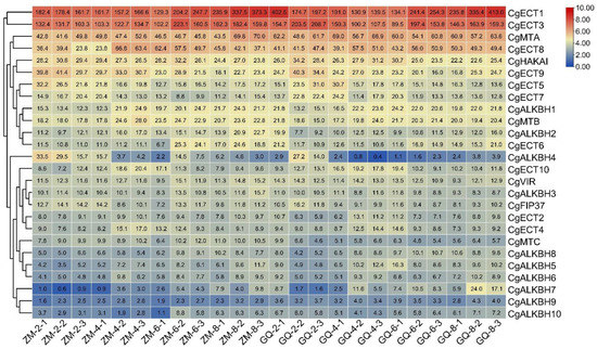 Expression patterns of m6A regulatory genes from C. grandis in the fruits of 2, 4, 6, and 8 cm diameters of two varieties. The bar at the right of the heat map represents relative expression values. FPKM-normalized log2 transformed counts. (ZM and GQ are the names of the two varieties, the first number followed with ZM or GQ stands for the diameter of the fruits and the last number represents the biological replicate).