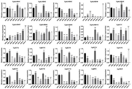 To illustrate the expression patterns of the m6A regulatory genes in C. grandis, the transcriptional profiles of the ZM and GQ fruits of various developmental points were investigated by RNA-seq and qRT-PCR, respectively. The heatmap showing the expression profiles of the genes was plotted based on the FPKM-normalized log2 transformed values. As illustrated in Figure 5 and Table S2, in the m6A reader groups, the expression levels of CgECT1 and CgECT2 in ZM and GQ were higher compared with that of other m6A regulatory genes. However, in the m6A eraser groups, the FPKM values of CgALKBH7, CgALKBH9, and CgALKBH10 were close to 0, indicating that almost no expression of the three genes was observed in these samples. Furthermore, the qRT-PCR analysis shown in Figure 6 and Figure S2 indicated that the gene expression patterns of most of the m6A regulatory genes were consistent with the RNA-Seq data. Nevertheless, the expression levels of CgMTA and CgMTC were not consistent with the RNA-Seq values (Figure 6 and Figure S2).