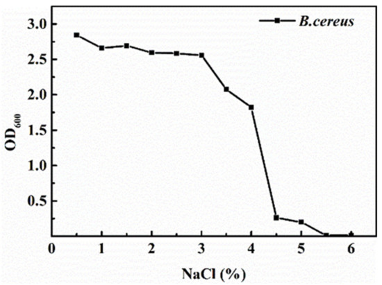 To ensure that B. cereus could survive under salt stress, the salt tolerance of B. cereus was determined. As shown in Figure 1, the OD600 value of B. cereus on the medium with a certain salt concentration (within 3%) has been maintained above 2.5, implying that all microorganisms can survive. With the increase in salt concentration, the activity of B. cereus sharply decreased, and when the salt concentration was 5.5%, B. cereus could not survive.