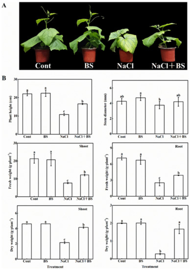 - NaCl+BS: Seedlings were grown in solid substrate containing NaCl (EC: 9.17 mS·cm−1) and treated with B. cereus suspension.
