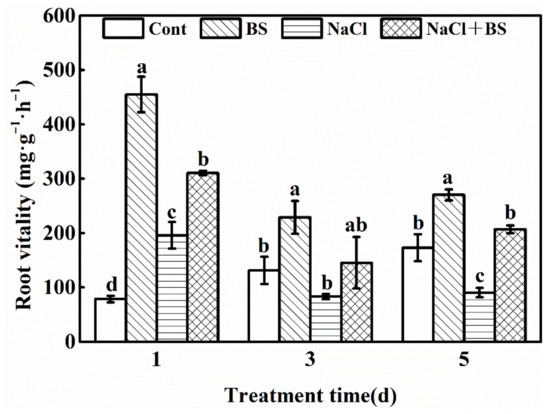 Effect of B. cereus on the root vitality of cucumber seedlings under salt stress. Bars represent standard errors. Different letters indicate a significant difference in the same parameter between treatments at p < 0.05.