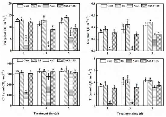 As shown in Figure 4, compared with the control: Pn was significantly increased by 17.18%, and 16.63% at 3 d and 5 d after B. cereus treatment; Gs significantly increased by 15.72%, 23.71%, and 11.90% at 1 d, 3 d and 5 d after B. cereus treatment; Ci increased by 4.24% at 5 d after B. cereus treatment; Tr increased by 6.76% on the 1st day after B. cereus treatment. On the 1st, 3rd, and 5th days after salt stress treatment: the Pn of seedlings decreased by 59.52%, 81.58%, and 37.09%; Gs decreased by 91.31%, 91.37%, and 41.58%; Ci decreased by 60.35%, 13.77%, and 7.04%; and Tr decreased by 88.51%, 87.44%, and 26.37%, respectively, compared with the control. Under salt stress, the gas exchange parameters of seedlings were significantly increased at 1 d, 3 d, and 5 d after B. cereus treatment. Compared with salt stress: Pn was significantly increased by 144.08%, 342.27%, and 24.95%; Gs was significantly increased by 1017.14%, 784.83%, and 10.98%; Ci was significantly increased by 150.70%, 16.42%, and 4.69%; and Tr was significantly increased by 685.43%, 524.22%, and 10.04%.