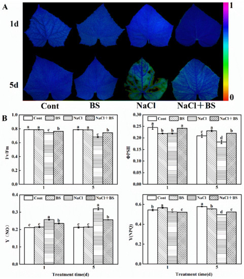 After 1 d and 5 d of treatment, cucumber seedlings were exposed to dark for 30 min. The second fully expanded functional leaf was selected and placed upward in fluorescence imaging system (IMAGINE-PAM, Heinz Walz, Effeltrich, Germany) to determine chlorophyll fluorescence parameters. Maximum photochemical quantum yield (Fv/Fm), actual photochemical quantum yield (ΦPSII), the quantum yield of non-regulated energy dissipation Y (NO), and quantum yield of regulated energy dissipation Y (NPQ) were measured and calculated by reference to Wu’s method [23].