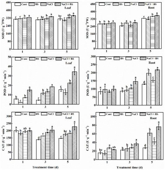 Compared with the control, the CAT content in seedling leaves decreased by 10.61% on the first day and increased by 18.6% on the third day after B. cereus treatment. At 3 d and 5 d after NaCl treatment, CAT content in seedling leaves increased by 36.47% and 23.81% compared with the control. Compared with salt stress, inoculation of B. cereus under salt stress increased CAT content in seedling leaves by 2.91%, 8.50%, and 25.55%, respectively. B. cereus increased the CAT content in seedling roots and reached the peak at 5 d after treatment, which was 125.10% higher than that of the control. Compared with the control, salt stress increased CAT content in seedling roots by 71.88%, 25.93%, and 51.01%, respectively. Under salt stress, the CAT content in seedling roots increased on the third and fifth days after treatment with B. cereus, which increased by 30.59% and 80.45%, respectively, compared with that under salt stress.