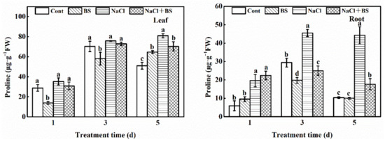 Effect of B. cereus on the content of proline in cucumber seedlings under salt stress. Bars represent standard errors. Different letters indicate a significant difference in the same parameter between treatments at p < 0.05.