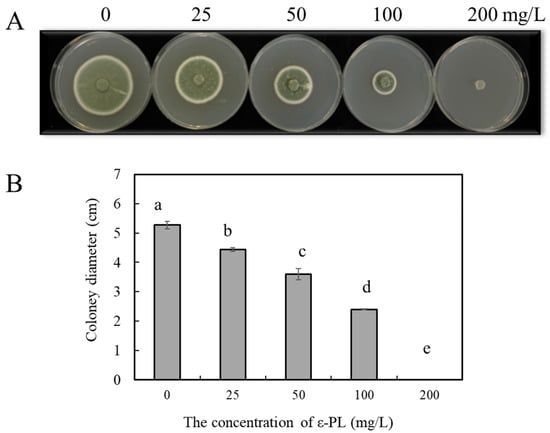 Effect of ε-PL treatment on the growth of P. expansum in vitro. (A) Colony growth and (B) colony diameter of P. expansum cultured for 6 days. The data are shown as mean ± SD, n = 3. According to Tukey’s test, different letters indicate significant differences (p < 0.05).