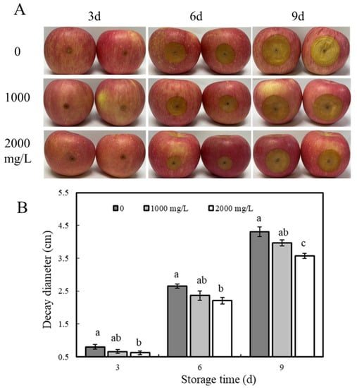 Effect of ε-PL treatment on the infection of P. expansum in apples after harvest. (A) Apple fruits were wound-inoculated with 10 μL spore suspension of P. expansum at 1 × 104 spores/mL, then treated with ε-PL at different concentrations (0, 1000, and 2000 mg/L) for storage at room temperature. Lesion diameters (B) were recorded after inoculation every 3 days. The vertical bar represents the standard deviation (n = 3). Different letters indicate significant different according to Tukey’s test (p < 0.05).