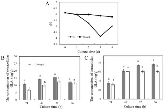 Effect of ε-PL treatment on the acid production of P. expansum in vitro. (A) pH change of the PDB supernatant during the growth of P. expansum, (B) the intracellular gluconic acid content of mycelia during the growth of P. expansum, and (C) extracellular gluconic acid content during the growth of P. expansum (GLA = gluconic acid). The data provided are the average of three repetitions. The vertical bar represents the standard deviation. According to Tukey’s test, different letters indicate significant differences (p < 0.05).