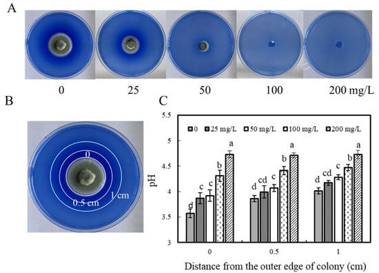 Effect of ε-PL treatment on aniline blue dye test to determine acidity. (A) The colony status of P. expansum on PDA after adding aniline blue for 6 days; (C) After 6 days of culture, the pH of the PDA medium at 0, 1, or 2 cm from the outer edge of the lesion (B). The vertical bar represents the standard deviation. According to Tukey’s test, different letters indicate significant differences (p < 0.05).