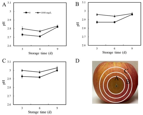 Referring to the method of Jiao et al. [], apples were divided into 4 groups, each group contained 4 replicate subgroups, and each subgroup consisted of 3 apples. The apples were stabbed at the equatorial area with sterile steel nails (width × length × depth = 3 mm × 2 mm × 3 mm). All the apples were inoculated with 10 μL of spore suspension (1 × 105/mL) and then air-dried at RT. After 2 h, 10 μL of sterile ε-PL solutions of different concentrations (0, 1000, and 2000 mg/L) were injected into the apples of each group at the inoculation site. After drying at RT, the fruit were placed in plastic baskets (320 mm × 240 mm × 100 mm), sealed with polyethylene bags, and a relative humidity of 90~95% was maintained with damp gauze, after which the fruit were stored at RT. The diameter of the lesions (cross-diameter method) and pH value were measured during storage, and then tissue samples were taken at 0, 1, or 2 cm from the outer edge of the lesion, referred to as areas A, B, and C, respectively. Samples were frozen with liquid nitrogen and stored at −80 °C. The fruit inoculation experiment was carried out 3 times with 3 replicates, each with 10 fruit per replicate.