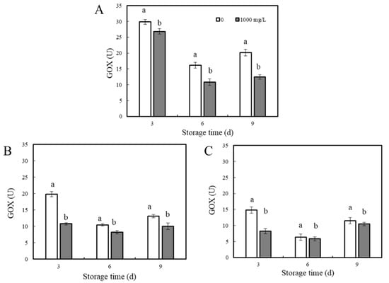 Effects of ε-PL treatment on GOX activity in different areas of the P. expansum–apple interaction. The GOX activity of interaction area A (A), area B (B) and area C (C) was measured on days 3, 6, and 9, respectively. The vertical bar represents the standard deviation (n = 3). Different letters indicate significant different according to Tukey’s test (p < 0.05).
