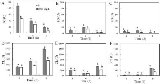 When plant pathogens, such as P. expansum, P. digitatum, and P. italiensis, infect fruit, they cause tissue maceration and rot, accompanied by the secretion of cell-wall-degrading enzymes []. Cell-wall-degrading enzymes disrupt cell cohesion mainly by degrading pectin and cellulose [], in which polygalacturonase (PG) and cellulose (CL) play important roles []. The pretreatment of cell walls with PG appears to promote the ability of other cell-wall-degrading enzymes to attack their substrates. CL primarily hydrolyzes polysaccharides with 1,4-β-glucosidic linkages that play a major role in cellulose degradation [].