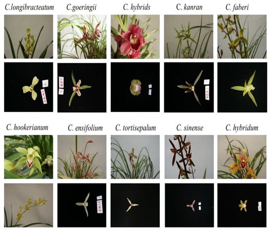Orchidaceae is one of the largest and most diverse flowering plants and has been widespread all around the world []. Cymbidium, belonging to the Orchidaceae family, with elegant and upright leaves and fragrant flowers, is the most important and economic flowering genus. It is popular in Asia, especially in China, Japan, Korea, and Southeast Asia []. In China, the Cymbidium has more than a thousand years of history with extremely high cultural and economic value []. The flowers of Cymbidium have various colors and shape patterns, which usually leads to confusion when comparing cultivars to assess genetic resources at the species level []. In recent years, with the continuous development of the Cymbidium industry, the number of Cymbidium germplasm resources has increased year by year, which greatly increases the difficulty of orchid classification, identification, and development. Traditional approaches for the classification of Cymbidium cultivars are based on morphological traits, which are difficult due to the problems associated with morphological variability, growth conditions, overlapping geographical origins, and individual biases, and most of these cultivars are related [,,]. It requires professionals but offers jugged with subjective. Molecular recognition is the most effective method to identify the various Cymbidium cultivars [,,], but often time and cost-consuming, making it unsuitable for high throughput and rapid classification.