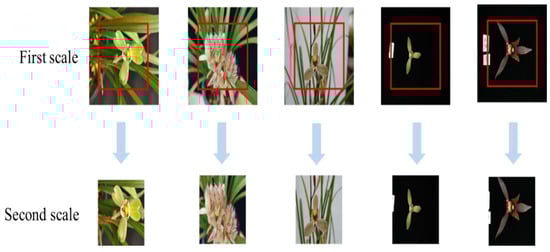 Before model training, Cymbidium images were subjected to two-scale processing to improve the robustness of the classification model established by the image with different backgrounds []. Figure 2 shows an image sample randomly selected from 10 Cymbidium species. The red frame represents the second scale image captured. First, set the original image to a size of 224 × 224 to obtain an image of the first scale. Since the recognition targets were basically located in the middle of the images, the experiment chose to intercept a partial image from the center of the first scale image (the height and width of the partial image were both 0.8 times of the first scale image) as the second scale image. The size of the second scale image was the same as the first scale image, which was 224 × 224 [].