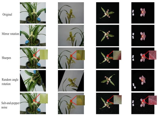 The original data set was divided into training, validation, and test sets at a ratio of 8:1:1. Although the diversity of sample species and morphology were considered in the image collection process, the growth of orchids and the imaging angle were random []. This experiment mainly chose mirror rotation, sharpening, salt-and-pepper noise, and random angle rotation to enhance the image set [,,]. The total number of samples was expanded by four times, and the effects before and after image enhancement are shown in Figure 3.