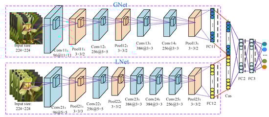 In this part, we proposed a global–local CNN (GL-CNN) network to achieve accurate classification of different kinds of Cymbidium. The network consists of two types of features extracted from the trained GL-CNN. The first branch network is the global feature, denoted as “Gnet.” The second feature is used to capture the local information of the input image, denoted as “LNet” []. The overall network structure is shown in Figure 4. The model input consists of two parts. The original image is input to GNet with a size of 224 × 224, and the corresponding local images of the same size are input to LNet. There is a one-to-one correspondence between input images of two scales. This operation expands the original image information from the data level by expanding the resolution of the input image in the LNet branch.