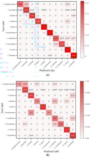 Deep learning is still data-driven, and the size and quality of the data set will directly affect the effectiveness of network training []. Due to the limitation of the data set size, it may be difficult to train CNN. This study found that the precision, recall, and F1-score of each model on C. hookerianum are quite different. This is due to the small sample size of C. hookerianum, which makes the stability performance of the model different. Therefore, the training model is not sensitive enough to recognize the experimental samples. By increasing the number of such images, the compatibility of the classification model for different Cymbidium species can be improved.