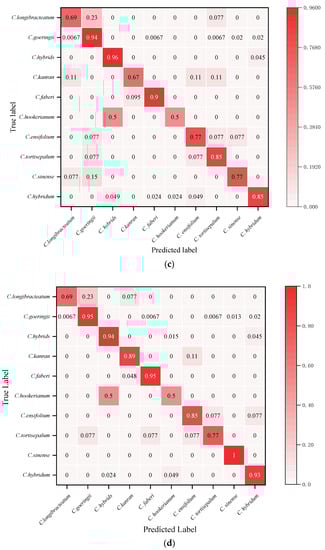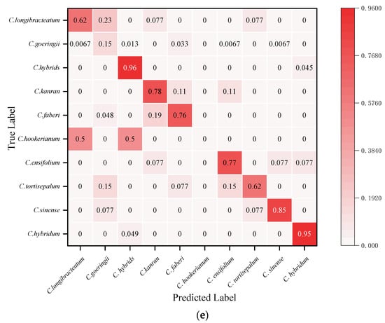 The visual confusion matrix was used to count the classification results of different Cymbidium species (Figure 5). The true category (ordinates) and the predicted category (abscissa) were compared to obtain the classification rate of each species. The GL-CNN model has the highest prediction accuracy for C. faberi and C. hookerianum, with an accuracy rate of 100%, followed by C. hybridum, with an accuracy rate of 98% (Figure 5a). From the numerical distribution of the confusion matrix, it can be observed that all models have achieved high classification accuracy on C. hybrids, and their average classification rates have reached 95.6%. In addition, there have been more misclassifications between C. goeringii, C. longibracteatum, and C. tortisepalum. In general, the model GL-CNN built by this project has achieved a high individual classification rate in most orchid species recognition. The recognition performance of VGG16 is poor, and there is a serious misclassification phenomenon.