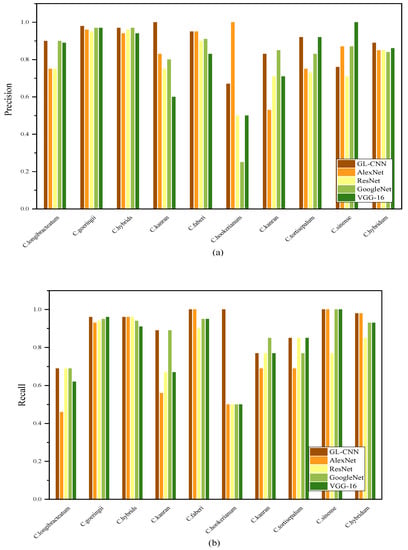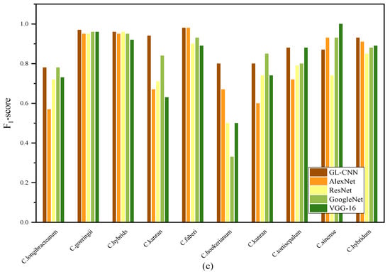 Figure 6 shows the precision, recall, and F1-score of 5 models for classifying 10 Cymbidium species. Among them, the precision, recall, and F1-score of each model on C. goeringii and C. hybrids all reached high values. On the contrary, the precision, recall, and F1-score of the five models on the C. hookerianum are quite different. GL-CNN has the highest precision, with an average of 89%. ResNet’s average precision is the lowest, only 78%, indicating that there are many samples misclassified under this method. Using the AlexNet model, many samples were misclassified to other varieties (the average recall rate was 0.78) because the differences between the samples were small, and there was a certain degree of difficulty in recognition. The precision and recall rate of different models are quite different, which indicates that the recognition difference of each model is more prominent in the categories that are more difficult to distinguish, showing a certain degree of unstable performance. In addition, GL-CNN showed high precision and recall rates in 10 different species of Cymbidium, indicating its strong ability to extract nuances.