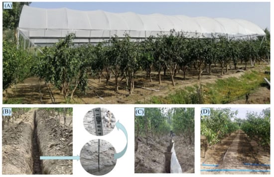 The experiment was conducted in a jujube orchard of Alar City 10 Regiment, Aksu Prefecture, Xinjiang Region (40°59′ N 81°28′ E), located on the southern edge of the Taklamakan desert; it has a continental arid desert climate with an annual average temperature of 10.4 °C, an annual average precipitation of 40.1~82.5 mm, and an annual average evaporation of 1876.6~2558.9 mm. The materials used in the experiment were 10-year-old “Junzao” jujube trees, with wild jujube as rootstock. The row spacing was 4 m, and the plant spacing was 2 m (1250 trees/hm2). A rain shelter was arranged above the test site to prevent the impact of rainwater on treatment (Figure 1A). Connections between treatments were intercepted by digging a 100 cm deep ditch (Figure 1B) filled with a double-layer plastic film to prevent leakage and isolate plots (Figure 1C) so that the treatments of each plot did not affect each other. Four drip lines (two emitters with 0.3 m intervals; 3.2 L/h for each emitter) located 0.4 and 0.8 m away from the tree row provided the salt–alkali solution on both sides of the trees (Figure 1D). The soil was sandy loam, and the jujube trees were distributed in a 0–60 cm soil layer.