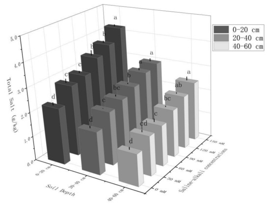 Total salinity in 0–20, 20–40, and 40–60 cm soil layers under different saline–alkali treatments. Note: Small letters indicate significant differences at a 5% level (p ≤ 0.05).