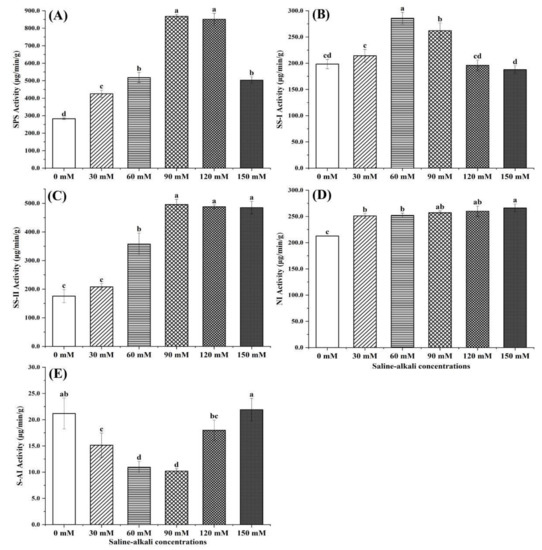 Differences of the sucrose metabolic enzyme activities in jujube fruits under different saline–alkali stress conditions. (A) SPS activity; (B) SS-I activity; (C) SS-II activity; (D) NI activity; (E) S-AI activity. Note: values indicate the means ± SE, n = 3. Small letters indicate significant differences at a 5% level (p ≤ 0.05).