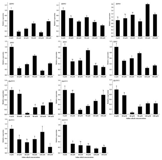 Differences in key enzyme genes of sucrose metabolism in jujube fruits under saline–alkali stress. Note: values indicate the means ± SE, n = 3. Small letters indicate significant differences at a 5% level (p ≤ 0.05).