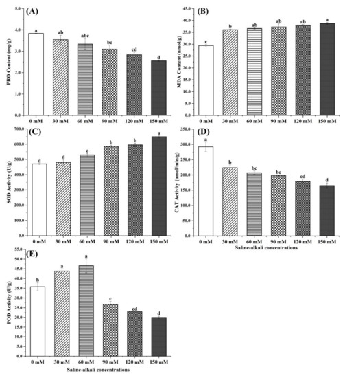 The MDA level directly reflects the degree of cell membrane damage and the level of lipid peroxidation [47,48]; this elevation of MDA occurrence might be due to the impairment of the cell membrane, reduction of lipid peroxidation level insufficient activity of enzymatic antioxidant [49]. In the current experiment, the MDA content increased gradually in a concentration-dependent manner in the “Junzao” jujube fruit under saline–alkali stress, which indicates that membranes were increasingly severely damaged with increasing saline–alkali stress. A similar increase in MDA was also observed in Arabidopsis [50], tomato [51,52], wheat [53], maize [54], tobacco [55] with salt stress.