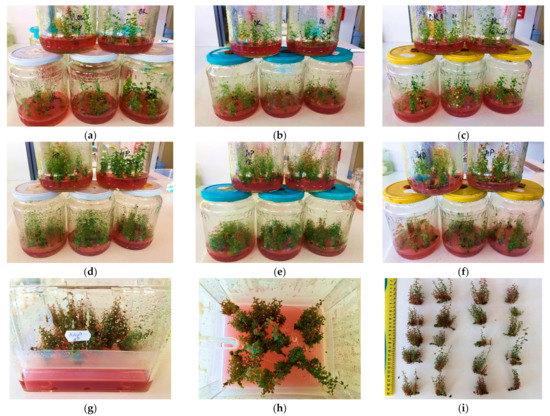 In vitro propagation of V. corymbosum L. cvs Duke and Hortblue Petite: (a) Duke after 12 weeks of in vitro culture in WPM medium (McCown’s Woody Plant medium) supplied with 0.5 mg/L zeatin (Z) and gelled with 5 g L Plant agar; (b) Duke after 12 weeks of in vitro culture in WPM medium supplied with 1 mg/L Z and gelled with 5 g/L Plant agar; (c) Duke after 12 weeks of in vitro culture in WPM medium supplied with 5 mg/L N6-(2-Isopentenyl) adenine (2iP) and gelled with 5 g/L Plant agar; (d) Hortblue Petite after 12 weeks of in vitro culture in WPM medium supplied with 0.5 mg/L Z and gelled with 5 g/L Plant agar; (e) Hortblue Petite after 12 weeks of in vitro culture in WPM medium supplied with 1 mg/L Z and gelled with 5 g/L Plant agar; (f) Hortblue Petite after 12 weeks of in vitro culture in WPM medium supplied with 5 mg/L 2iP and gelled with 5 g/L Plant agar; (g–i) Hortblue Petite after 12 weeks of in vitro culture in WPM medium supplied with 5 mg/L 2iP in bioreactor.