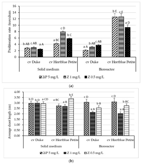 Our preliminary research [28,29,30,31,32,33,34,35,36] has shown that micropropagation is influenced by the type of plant growth regulators (PGRs), culture media and plant species. The results of the present study showed that the two in vitro culture systems (solid and liquid [Plantform bioreactor via a TIS]), as well the two PGRs, 2iP (5 mg/L) and Z (1 mg/L Z; 0.5 mg/L), differently influenced the proliferation rate, length of shoots and fresh weights of both V. corymbosum cultivars (Duke and Hortblue Petite) (Figure 1).