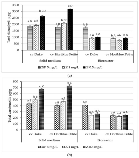 In the case of both cultivars, the solid media (agar) supported the highest carotenoid and chlorophyll contents, with 0.5 mg/L Z supplementation reaching the highest values. As in accordance with the literature, chlorophyll a was identified in the highest amount, ranging from 1477.052 ± 4.46 μg/g (maximum value) to 451.440 ± 1.48 μg/g (lowest value) for the Duke cultivar, and from 1325.398 ± 5.32 μg/g to 479.281 ± 2.87 μg/g for Hortblue Petite. Chlorophyll b was found in approximately half amounts when compared to chlorophyll a for both cultivars and all PGRs. Moreover, pheophytin b registered the lowest quantities, precisely under 22 μg/g, for both cultivars and both types of culture media (the lowest being approximately 5 μg/g in 1 mg/L Z TIS for both cultivars). It is interesting to observe that pheophytin a and b were found in high amounts compared to the plants; in general, amounts which are supported by an acidic culture media, the same as the ones used in the present study (pH = 5). Hortblue Petite registered the highest concentration of pheophytin a (1097.240 ± 1.74 μg/g in solid media with 0.5 mg/L Z).