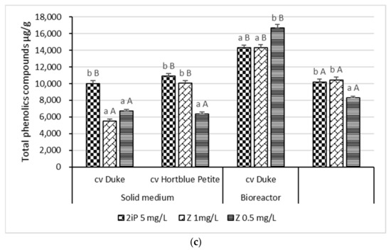 Regarding the phenolics values, as illustrated in Figure 3c, the TIS conditions supported the richest contents, for both varieties, on all three PGRs variations, whereas Duke presented the highest concentration in 0.5 mg/L Z (16,665.62 ± 424.63 μg/g).