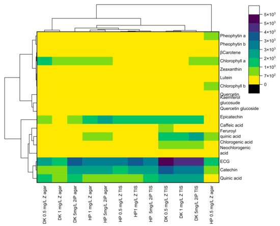 Heat map showing the content of individual phenolic, carotenoid and chlorophyll compounds in the shoot extracts of the two highbush blueberry varieties (DK—Duke, and HP—Hortblue Petite), on two types of culture systems (solid medium/5 g/L Plant agar and liquid medium/Plantform bioreactor) and three variation of growth regulators (0.5 mg/L and 1 mg/L zeatin and 5 mg/L N6-(2-Isopentenyl) adenine). A yellow box indicates the chemical compounds’ content was lower than the average level, and a blue box indicates the chemical compounds’ content was higher than the average level.