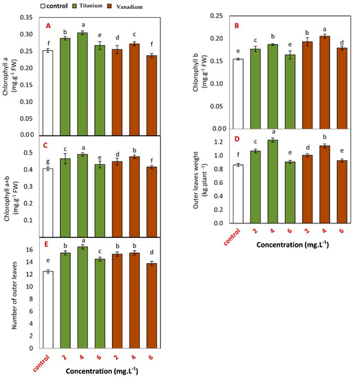 Chlorophyll a (A); chlorophyll b (B); total chlorophyll (C); outer leaves weight (D); and number of outer leaves (E) of red cabbage plants treated with Ti and V. Data are presented as means of three replicates. Different letters refer to significant difference at p < 0.05 according to the Duncan test (n = 3).