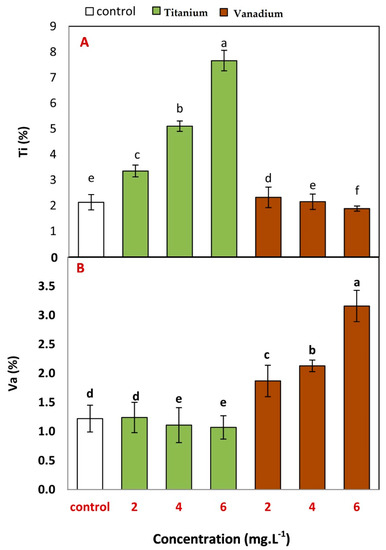 Our results in Figure 2 indicated that the V content in red cabbage plants was increased by V foliar application, while Ti levels remained constant compared with control. The same trend was observed in Ti content. These results are in agreement with Ram et al. [37] and Pais [38], who found that Ti content was increased by Ti application in the leaves of beans and maize plants, respectively.