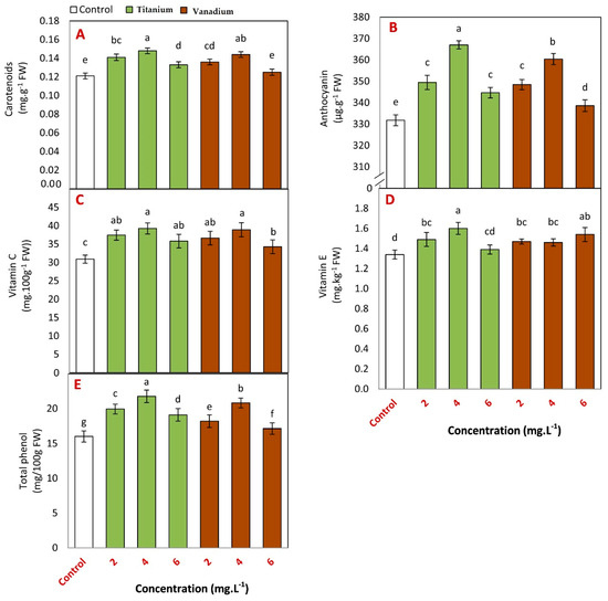 Results of Figure 3 show the influence of Ti and V applications on the non-enzymatic antioxidants (vitamin C, vitamin E, carotenoids, anthocyanin and total phenols) of red cabbage leaves. Foliar application with Ti2 (4.0 mg L−1) resulted in maximum values of all of the previous parameters compared with the control. In addition, the control treatment showed the lowest values compared to the other treatments. Ti application was more effective than V application for enhancing vitamin C, vitamin E, carotenoids, anthocyanin and total phenols.
