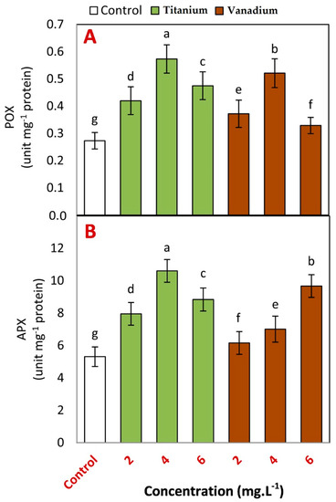 Effect of Ti and V foliar applications on peroxidase (A) and ascorbate peroxidase (B) activities in red cabbage leaves. The mean values followed by different letter are significantly different at p < 0.05 according to the Duncan test (n = 3).